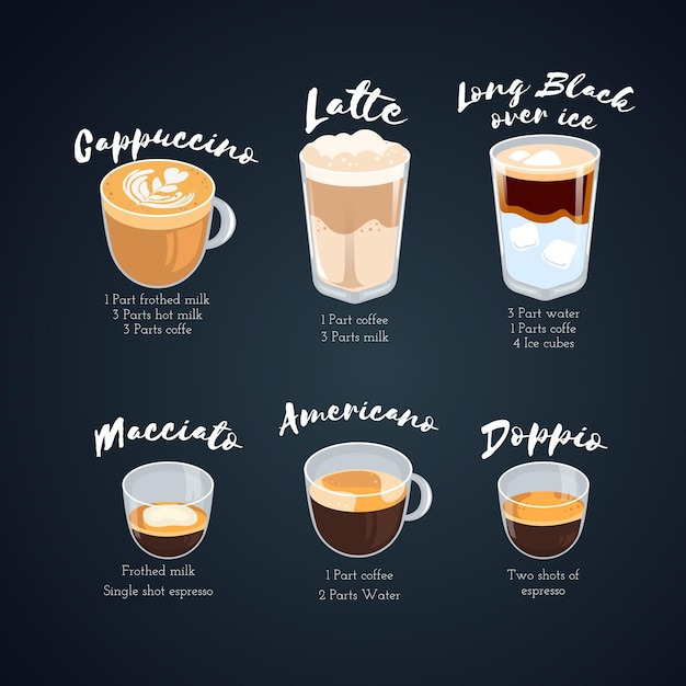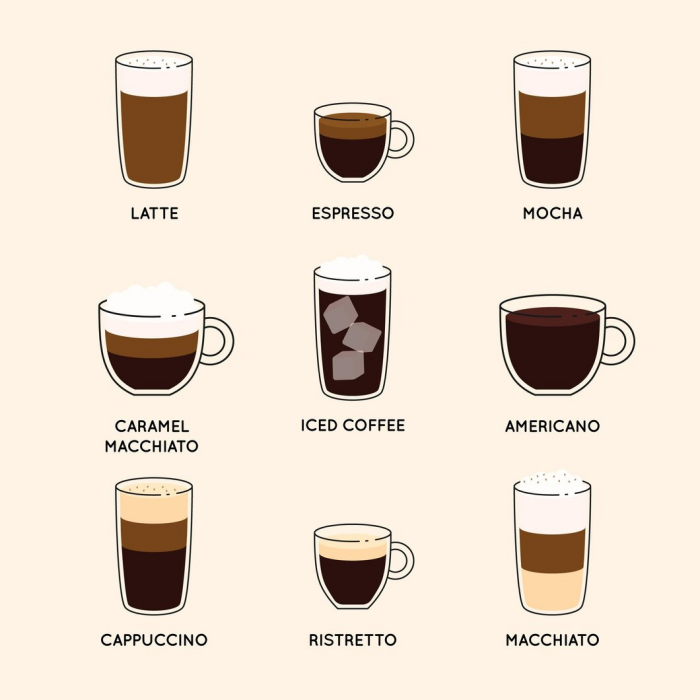 에스프레소를 기반으로 한 커피는 수십 가지가 있으며, 추가되는 물, 우유, 시럽, 거품의 양에 따라 맛이 달라집니다.