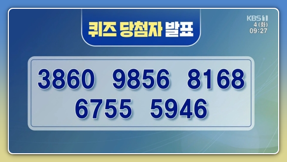 아침마당 돌발퀴즈 당첨자는 방송 마지막에 화면 하단에 휴대폰 전화번호 뒷자리로 발표됩니다. 이때, 전화번호 뒷자리만 표시되므로 정확한 확인이 어려울 수 있습니다. 따라서 더 자세한 정보를 원한다면 관련 프로그램의 공식 채널을 통해 확인할 수 있습니다.