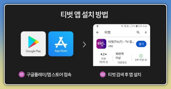 - 앱 설치: 스마트폰의 앱 스토어에서 'KBS 티벗'을 검색하여 설치합니다.