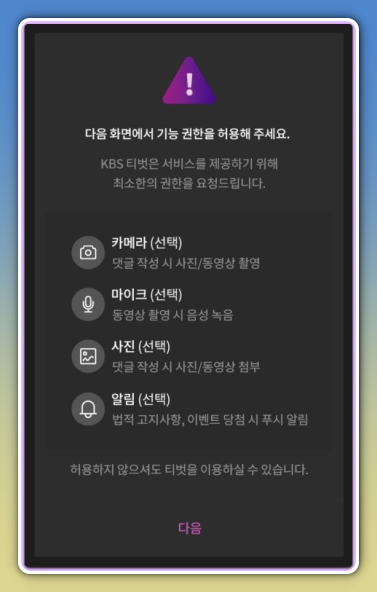 1. 기능 권한 허용: 앱 실행 시 기능 권한 허용을 묻는 메시지가 나타납니다. 이 권한은 선택 사항이므로 필요에 따라 허용하거나 거부할 수 있습니다.
