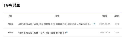 A: 누리집 홈페이지의 “TV 속 정보” 섹션에서 당일 방송된 맛집 정보를 확인할 수 있습니다. - Q3. 특산물 구매는 어떻게 하나요?